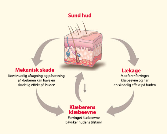 En este diagrama se puede observar cómo una fuga puede llegar a dañar la piel sana y, del mismo modo, la influencia que un traumatismo mecánico puede tener en la adherencia de la barrera cutánea de la ostomía.